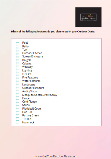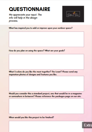Use this questionnaire to help us guide the initial conversations towards the outdoor oasis of your dreams. Click Link Below To Download the Questionnaire DocOutdoor Oasis Questionnaire